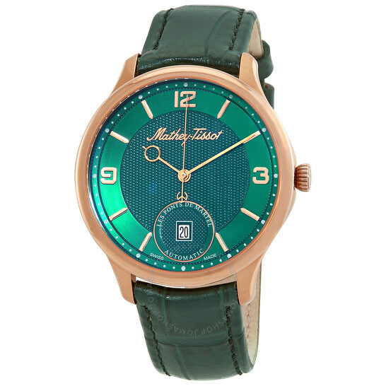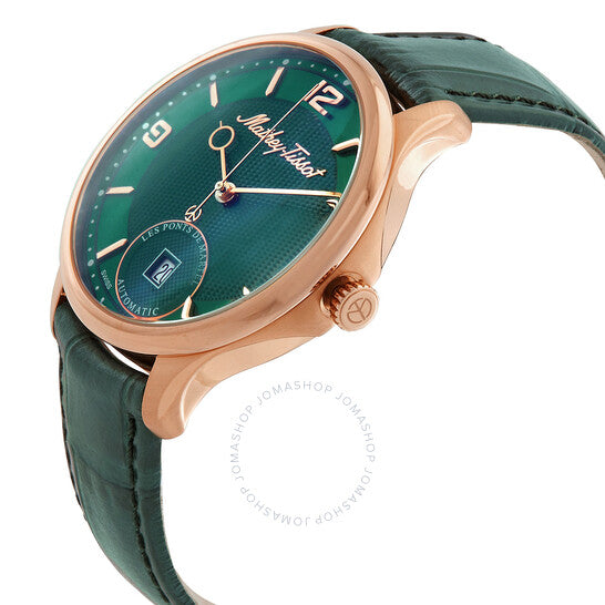 علبة من الفولاذ المقاوم للصدأ بلون الذهب الوردي مع حزام جلدي أخضر. إطار ثابت من الفولاذ المقاوم للصدأ بلون الذهب الوردي. ميناء أخضر بعقارب بلون الذهب الوردي وأرقام عربية وعلامات ساعات. علامات دقائق حول الحافة الخارجية. نوع الميناء: تناظري. عرض التاريخ عند موضع الساعة السادسة. حركة أوتوماتيكية من سيليتا كاليبر SW200، تحتوي على 26 جوهرة، تنبض بمعدل 28800 ذبذبة في الساعة، ولديها احتياطي طاقة لمدة 38 ساعة تقريبًا. زجاج من الياقوت المقاوم للخدش. تاج قابل للسحب/الدفع. غطاء خلفي شفاف. شكل العلبة دائري، حجمها: 42 مم. قابلة للطي مع مشبك مزدوج للفتح. مقاومة للماء حتى عمق 50 مترًا / 165 قدمًا. الوظائف: التاريخ، الساعة، الدقيقة، الثانية. سلسلة إدموند ثلاثية الأبعاد. طراز ساعة رسمية. ملصق الساعة: صناعة سويسرية. ساعة ماثي تيسوت إدموند ثلاثية الأبعاد أوتوماتيكية للرجال بمينا أخضر AC1886PVE.