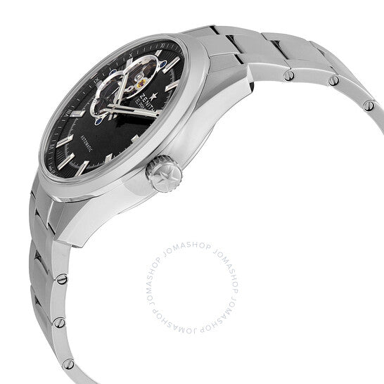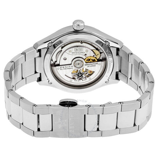 علبة من الفولاذ المقاوم للصدأ فضية اللون مع سوار من الفولاذ المقاوم للصدأ فضي اللون. إطار ثابت من الفولاذ المقاوم للصدأ فضي اللون. ميناء أسود مقطوع مع عقارب فضية اللون مضيئة وعلامات ساعات (أرقام رومانية صغيرة) وعلامات دقائق حول الحافة الخارجية. نوع الميناء: تناظري. عقارب وعلامات مضيئة. ميناء فرعي واحد يعرض: ثانية صغيرة. حركة أوتوماتيكية Zenith Calibre El primero 4613، مبنية على Zenith El Primero 400، تحتوي على 19 جوهرة، مكونة من 160 جزءًا، تنبض بسرعة 36000 ذبذبة في الساعة، ولديها احتياطي طاقة يبلغ حوالي 50 ساعة. كريستال ياقوت مقاوم للخدش. تاج سحب/دفع. غطاء خلفي شفاف. شكل العلبة دائري، حجم العلبة: 40 مم، سمك العلبة: 11.7 مم. مشبك قابل للطي. مقاومة للماء حتى عمق 100 متر / 330 قدمًا. الوظائف: الساعة، الدقائق، الثواني الصغيرة. سلسلة El Primero Synopsis. طراز ساعة فاخرة. علامة الساعة: صناعة سويسرية. ساعة زينيث إل بريميرو أوتوماتيكية للرجال 032170461321M2170.