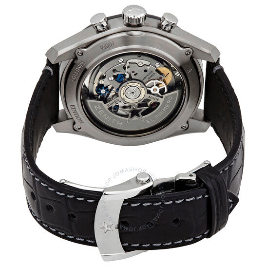 علبة من التيتانيوم الرمادي مع سوار أسود من جلد التمساح. إطار ثابت من السيراميك الأسود. ميناء هيكلي بعقارب ومؤشرات ساعات فضية مضيئة. مؤشرات دقائق. مؤشرات عُشر ثانية حول الحافة الخارجية. نوع الميناء: تناظري. عقارب ومؤشرات مضيئة. عرض التاريخ عند موضع الساعة السادسة. كرونوغراف - ثلاثة موانئ فرعية تعرض: 60 ثانية، 60 دقيقة، وعُشر ثانية. حركة أوتوماتيكية من عيار زينيث، El Primero 3600، مع احتياطي طاقة لمدة 60 ساعة. كريستال ياقوت مقاوم للخدش. تاج قابل للسحب/الدفع. غطاء خلفي شفاف. شكل دائري. حجم العلبة: 42 مم. سمكها: 12.75 مم. مشبك قابل للطي. مقاومة للماء حتى عمق 100 متر / 330 قدمًا. الوظائف: كرونوغراف، تاريخ، ساعة، دقيقة، ثانية. معلومات إضافية: إصدار محدود. سلسلة El Primero. تصميم ساعة فاخر. علامة الساعة: صناعة سويسرية. ساعة زينيث إل بريميرو كرونوغراف أوتوماتيكية للرجال 95.3001.3600/69.C817.