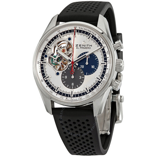 علبة من الفولاذ المقاوم للصدأ مع سوار مطاطي أسود. إطار ثابت من الفولاذ المقاوم للصدأ. ميناء فضي (قلب مفتوح) بعقارب فضية اللون وعلامات ساعات مؤشرة. علامات دقائق. علامات تاكيميتر حول الحافة الخارجية. نوع الميناء: تناظري. عقارب وعلامات مضيئة. كرونوغراف - ميناءان فرعيان يعرضان: ١٢ ساعة و٣٠ دقيقة. حركة أوتوماتيكية من عيار Zenith El Primero 4061، مستوحاة من Zenith El Primero 400، تحتوي على ٣١ جوهرة، مكونة من ٢٨٢ جزءًا، تنبض بمعدل ٣٦٠٠٠ ذبذبة في الساعة، ولديها احتياطي طاقة يقارب ٥٠ ساعة. زجاج من الياقوت المقاوم للخدش. تاج لولبي. غطاء خلفي شفاف. شكل دائري. حجم العلبة: ٤٢ مم. مشبك قابل للطي. مقاومة للماء حتى عمق ١٠٠ متر / ٣٣٠ قدمًا. الوظائف: كرونوغراف، عجلة عمودية، ساعات، دقائق، ثوانٍ صغيرة. سلسلة El Primero. تصميم ساعة فاخرة. ملصق الساعة: صناعة سويسرية. ساعة زينيث إل بريميرو كرونو ماستر كرونوغراف أوتوماتيكية للرجال 03.2040.4061/69.R576.