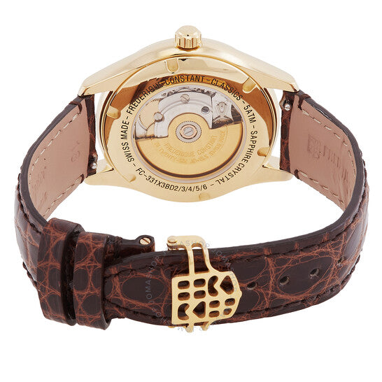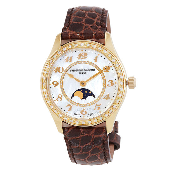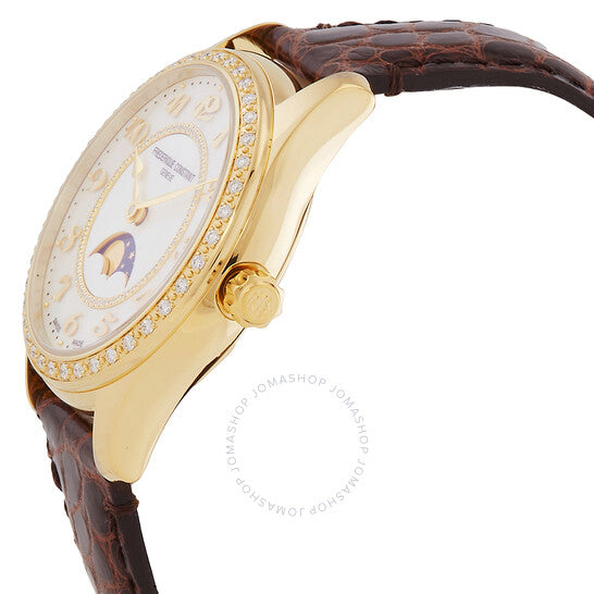 علبة من الفولاذ المقاوم للصدأ بلون ذهبي مع سوار جلدي بني. إطار ذهبي ثابت مرصع بالألماس من الفولاذ المقاوم للصدأ. ميناء فضي من عرق اللؤلؤ مع عقارب ذهبية اللون وعلامات ساعات بأرقام عربية. نوع الميناء: تناظري. حركة أوتوماتيكية من فريدريك كونستانت، عيار FC-331 (القاعدة SW280)، مع احتياطي طاقة لمدة 38 ساعة. غطاء خلفي شفاف. شكل العلبة دائري، مقاسها: 36 مم، سمكها: 10.6 مم. عرض السوار: 18 مم. مشبك قابل للطي. مقاومة للماء حتى عمق 50 مترًا / 165 قدمًا. الوظائف: الساعات، الدقائق، أطوار القمر. سلسلة إليجانس. طراز ساعة رسمية. علامة الساعة: صناعة سويسرية. ساعة فريدريك كونستانت إليجانس أوتوماتيكية كريستالية نسائية، FC-331MPWD3BD5.