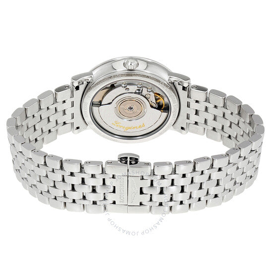 علبة من الفولاذ المقاوم للصدأ مع سوار من الفولاذ المقاوم للصدأ. إطار ثابت من الفولاذ المقاوم للصدأ. ميناء أبيض بعقارب سوداء وعلامات ساعات رومانية. علامات دقائق حول الحافة الخارجية. نوع الميناء: تناظري. عرض التاريخ عند موضع الساعة 3. حركة لونجين الأوتوماتيكية عيار L619/888، مبنية على ETA 2892، تحتوي على 21 جوهرة، تنبض بمعدل 25200 ذبذبة في الساعة، ولديها احتياطي طاقة لمدة 64 ساعة تقريبًا. زجاج من الياقوت المقاوم للخدش. تاج قابل للسحب/الدفع. غطاء خلفي شفاف. شكل دائري. حجم العلبة: 34.50 مم. سمك العلبة: 6 مم. عرض السوار: 20 مم. مشبك قابل للطي بزر ضغط للتحرير. مقاومة للماء حتى عمق 30 مترًا / 100 قدم. الوظائف: التاريخ، الساعة، الدقيقة، الثانية. سلسلة أنيقة. تصميم ساعة فاخرة. ملصق الساعة: صناعة سويسرية. ساعة لونجين الأنيقة الأوتوماتيكية النسائية بمينا أبيض من الفولاذ L4.809.4.11.6.