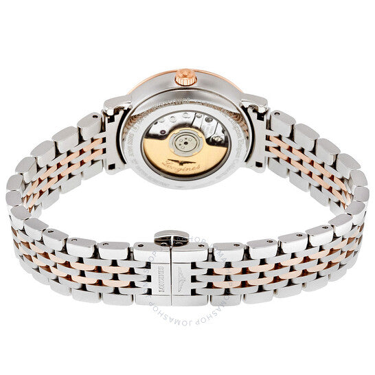 علبة من الفولاذ المقاوم للصدأ مع سوار من الفولاذ المقاوم للصدأ بوصلات من الذهب الوردي عيار 18 قيراطًا. إطار ثابت من الذهب الوردي عيار 18 قيراطًا. ميناء أبيض بعقارب وعلامات ساعات ذهبية وردية اللون. علامات دقائق حول الحافة الخارجية. نوع الميناء: تناظري. عرض التاريخ عند موضع الساعة 3. حركة لونجين أوتوماتيكية من عيار L595/592، مبنية على ETA 2000-1، تحتوي على 20 جوهرة، تنبض بمعدل 28800 ذبذبة في الساعة، ولديها احتياطي طاقة لمدة 40 ساعة تقريبًا. زجاج من الياقوت المقاوم للخدش. تاج قابل للسحب/الدفع. ظهر هيكلي. شكل دائري. حجم العلبة: 29 مم. سمك العلبة: 9 مم. عرض السوار: 14 مم. مشبك قابل للطي بزر ضغط. مقاومة للماء حتى عمق 30 مترًا / 100 قدم. الوظائف: التاريخ، الساعة، الدقيقة، الثانية. سلسلة أنيقة. طراز ساعة رسمية. علامة الساعة: صناعة سويسرية. ساعة لونجين الأنيقة للسيدات بمينا أبيض L43105127.