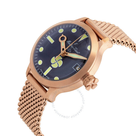علبة وسوار من الفولاذ المقاوم للصدأ مطليان بالذهب الوردي بتقنية PVD. إطار ثابت مطلي بالذهب الوردي بتقنية PVD. ميناء أزرق مع عقارب مضيئة بلون الذهب الوردي وعلامات ساعات منقطة. علامات دقائق حول الحافة الخارجية. نوع الميناء: تناظري. عقارب وعلامات مضيئة. عرض التاريخ عند موضع الساعة 3. حركة أوتوماتيكية من عيار Sellita SW200، تحتوي على 26 جوهرة، تنبض بمعدل 28800 ذبذبة في الساعة، ولديها احتياطي طاقة يدوم حوالي 38 ساعة. زجاج من الياقوت المقاوم للخدش. تاج لولبي. غطاء خلفي صلب. شكل دائري. حجم العلبة: 43.5 مم. سمك العلبة: 14 مم. عرض السوار: 20 مم. مشبك قابل للطي. مقاومة للماء حتى عمق 400 متر / 1320 قدمًا. الوظائف: التاريخ، الساعة، الدقيقة، الثانية. معلومات إضافية: 40 ضغط جوي. سلسلة Elica. طراز ساعة الغوص. ملصق الساعة: صناعة سويسرية. ساعة ماثي تيسوت إليكا أوتوماتيكية للرجال بمينا أزرق U-121PBU.