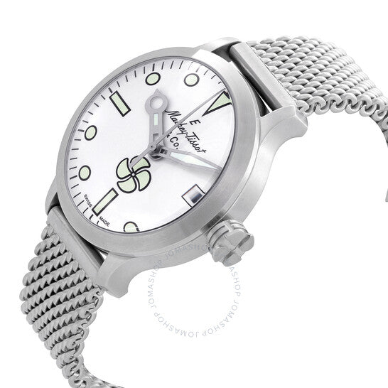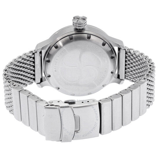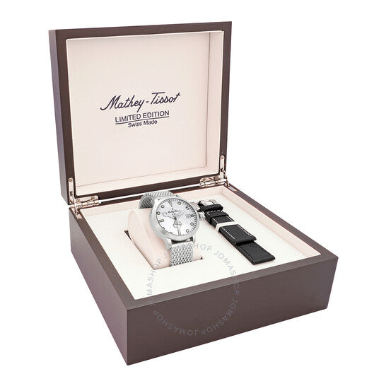 علبة من الفولاذ المقاوم للصدأ مع سوار شبكي من الفولاذ المقاوم للصدأ. إطار ثابت من الفولاذ المقاوم للصدأ. ميناء أبيض بعقارب فضية مضيئة وعلامات ساعات منقطة. علامات دقائق حول الحافة الخارجية. نوع الميناء: تناظري. عقارب وعلامات مضيئة. عرض التاريخ عند موضع الساعة 3. حركة أوتوماتيكية من عيار Sellita SW200، تحتوي على 26 جوهرة، تنبض بمعدل 28800 ذبذبة في الساعة، ولديها احتياطي طاقة لمدة 38 ساعة تقريبًا. زجاج من الياقوت المقاوم للخدش. تاج لولبي. غطاء خلفي صلب. شكل دائري. حجم العلبة: 43.5 مم. سمكها: 14 مم. مشبك قابل للطي بزر ضغط. مقاومة للماء حتى عمق 40 مترًا / 130 قدمًا. الوظائف: التاريخ، الساعة، الدقيقة، الثانية. معلومات إضافية: 40 ضغط جوي. سلسلة Elica. طراز ساعة الغوص. علامة الساعة: صناعة سويسرية. ساعة Mathey-Tissot Elica أوتوماتيكية للرجال بمينا أبيض U-121AI.