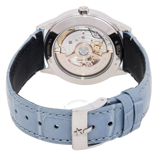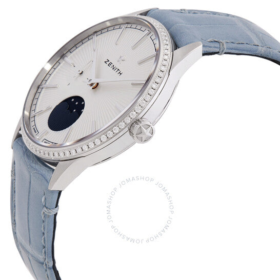 علبة من الفولاذ المقاوم للصدأ فضية اللون مع حزام من جلد التمساح بلون أزرق جينز. إطار ثابت مرصع بالألماس. ميناء فضي بنقشة أشعة الشمس مع عقارب فضية اللون وعلامات ساعات. نوع الميناء: تناظري. ميناء فرعي واحد يعرض: ثواني صغيرة. حركة أوتوماتيكية من زينيث كاليبر 692 مع احتياطي طاقة يصل إلى 50 ساعة. زجاج من الياقوت المقاوم للخدش. تاج قابل للسحب/الدفع. هيكل دائري الشكل، مقاسه 36 مم. مقاومة للماء حتى عمق 50 مترًا / 165 قدمًا. الوظائف: الساعات، الدقائق، الثواني، أطوار القمر. سلسلة إيليت. تصميم ساعة فاخرة. علامة الساعة: صناعة سويسرية. ساعة زينيث إيليت أوتوماتيكية نسائية مرصعة بالألماس 16.3200.692/01.C832.