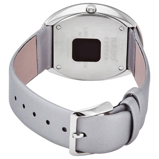 علبة من الفولاذ المقاوم للصدأ فضية اللون مع حزام جلدي فضي اللون. إطار ثابت من الفولاذ المقاوم للصدأ فضي اللون. ميناء فضي اللون مع عقارب فضية اللون. نوع الميناء: تناظري. حركة كوارتز. زجاج ياقوت مقاوم للخدش. تاج قابل للسحب/الدفع. غطاء خلفي صلب. شكل العلبة بيضاوي، مقاس العلبة: 33 مم، سمكها: 8 مم. عرض السوار: 17 مم، طوله: 7 بوصات. مشبك بإبزيم. مقاومة للماء حتى عمق 30 مترًا / 100 قدم. الوظائف: الساعات، الدقائق. تصميم ساعة فاخرة. علامة الساعة: صناعة سويسرية. ساعة رادو إيسينزا كوارتز نسائية بمينا فضي، R53739306.
