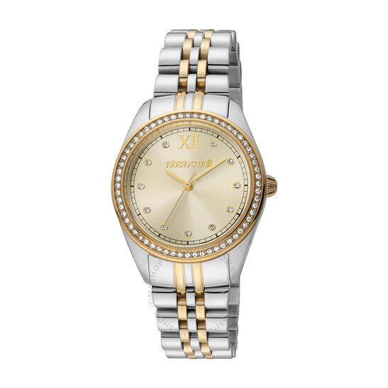 علبة من الفولاذ المقاوم للصدأ فضية اللون مع سوار من الفولاذ المقاوم للصدأ ثنائي اللون (فضي وذهبي أصفر). إطار ثابت من الفولاذ المقاوم للصدأ ذهبي أصفر. ميناء بلون الشمبانيا مع عقارب وعلامات ساعات ذهبية صفراء. علامات دقائق حول الحافة الخارجية. نوع الميناء: تناظري. حركة كوارتز. زجاج معدني مقاوم للخدش. شكل العلبة دائري، مقاسها: 31 مم. مشبك قابل للطي مع مفتاح أمان. مقاومة للماء حتى عمق 50 مترًا / 165 قدمًا. الوظائف: الساعات، الدقائق، الثواني. سلسلة ساعات أنيقة. نمط ساعات أنيقة. ساعة روبرتو كافالي أنيقة كوارتز بمينا شامبانيا نسائية RC5L036M0085.