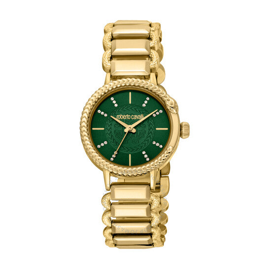 علبة وسوار من الفولاذ المقاوم للصدأ بلون الذهب الأصفر. إطار ثابت من الفولاذ المقاوم للصدأ بلون الذهب الأصفر. ميناء أخضر مع عقارب ومؤشرات ساعات بلون الذهب الأصفر. نوع الميناء: تناظري. حركة كوارتز. زجاج معدني مقاوم للخدش. علبة دائرية الشكل، مقاسها: 30 مم. مشبك قابل للطي مع قفل أمان. مقاومة للماء حتى عمق 50 مترًا / 165 قدمًا. الوظائف: الساعات، الدقائق، الثواني. سلسلة ساعات أنيقة. طراز ساعات أنيقة. ساعة روبرتو كافالي أنيقة كوارتز نسائية بمينا أخضر RC5L020M0065.