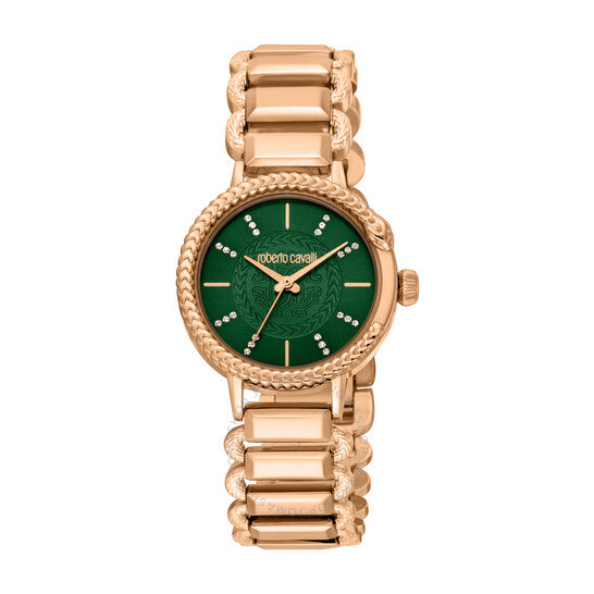 علبة وسوار من الفولاذ المقاوم للصدأ بلون الذهب الوردي. إطار ثابت من الفولاذ المقاوم للصدأ بلون الذهب الوردي. ميناء أخضر مع عقارب ومؤشرات ساعات بلون الذهب الوردي. نوع الميناء: تناظري. حركة كوارتز. زجاج معدني مقاوم للخدش. علبة دائرية الشكل، مقاسها: 30 مم. مشبك قابل للطي مع قفل أمان. مقاومة للماء حتى عمق 50 مترًا / 165 قدمًا. الوظائف: الساعات، الدقائق، الثواني. سلسلة ساعات أنيقة. طراز ساعات أنيقة. ساعة روبرتو كافالي أنيقة كوارتز نسائية بمينا أخضر RC5L020M0075.