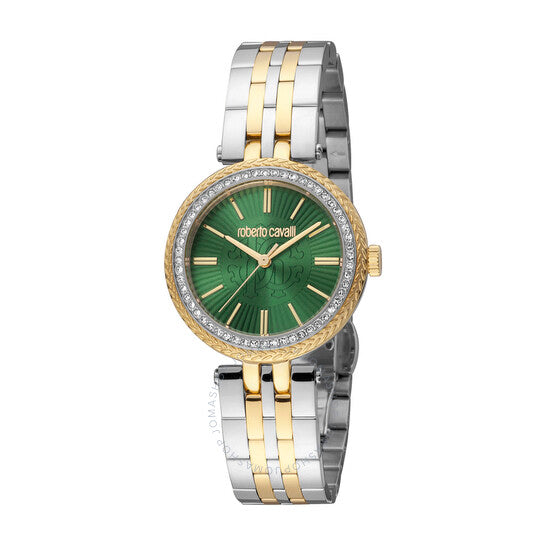 علبة من الفولاذ المقاوم للصدأ فضية اللون مع سوار من الفولاذ المقاوم للصدأ ثنائي اللون (فضي وذهبي أصفر). إطار ثابت من الفولاذ المقاوم للصدأ ذهبي أصفر. ميناء أخضر مع عقارب ومؤشرات ساعات ذهبية صفراء. نوع الميناء: تناظري. حركة كوارتز. زجاج معدني مقاوم للخدش. شكل العلبة دائري، مقاسها: 30 مم. مشبك قابل للطي مع مفتاح أمان. مقاومة للماء حتى عمق 50 مترًا / 165 قدمًا. الوظائف: الساعات، الدقائق، الثواني. سلسلة ساعات أنيقة. طراز ساعات أنيقة. ساعة روبرتو كافالي أنيقة كوارتز نسائية بمينا أخضر RC5L031M0095.