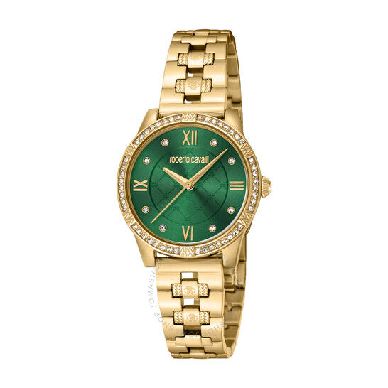 علبة وسوار من الفولاذ المقاوم للصدأ بلون الذهب الأصفر. إطار ثابت من الفولاذ المقاوم للصدأ بلون الذهب الأصفر. ميناء أخضر مع عقارب ومؤشرات ساعات بلون الذهب الأصفر. نوع الميناء: تناظري. حركة كوارتز. زجاج معدني مقاوم للخدش. علبة دائرية الشكل، مقاسها: 30 مم. مشبك قابل للطي مع مفتاح أمان. مقاومة للماء حتى عمق 50 مترًا / 165 قدمًا. الوظائف: الساعات، الدقائق، الثواني. سلسلة ساعات أنيقة. طراز ساعات أنيقة. ساعة روبرتو كافالي أنيقة كوارتز نسائية بمينا أخضر RC5L032M0065.