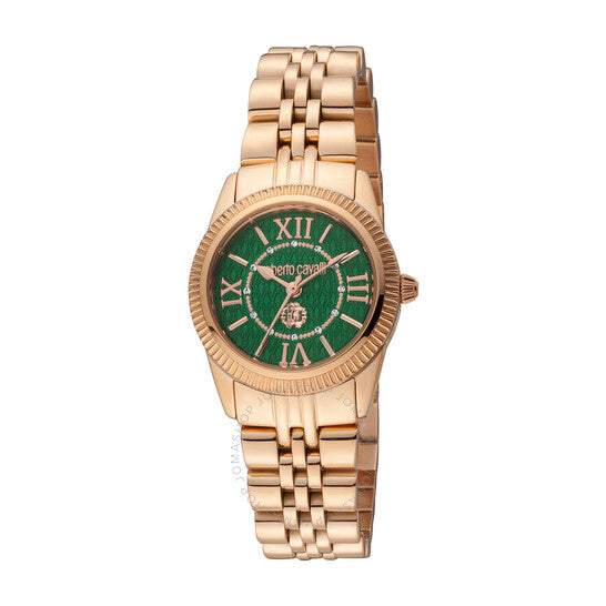 علبة وسوار من الفولاذ المقاوم للصدأ بلون الذهب الوردي. إطار ثابت من الفولاذ المقاوم للصدأ بلون الذهب الوردي. ميناء أخضر مع عقارب بلون الذهب الوردي وعلامات ساعات بأرقام رومانية. نوع الميناء: تناظري. حركة كوارتز. زجاج معدني مقاوم للخدش. هيكل دائري، مقاسه ٢٨ مم. مشبك قابل للطي مع قفل أمان. مقاومة للماء حتى عمق ٥٠ مترًا / ١٦٥ قدمًا. الوظائف: الساعات، الدقائق، الثواني. سلسلة ساعات أنيقة. طراز ساعات أنيقة. ساعة روبرتو كافالي أنيقة كوارتز نسائية بمينا أخضر RC5L035M0075.