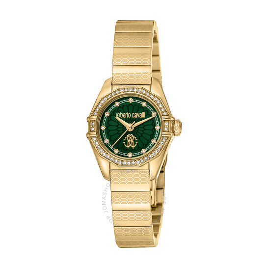 علبة وسوار من الفولاذ المقاوم للصدأ بلون الذهب الأصفر. إطار ثابت من الفولاذ المقاوم للصدأ بلون الذهب الأصفر. ميناء أخضر مع عقارب وعلامات ساعات ذهبية اللون. علامات دقائق حول الحافة الخارجية. نوع الميناء: تناظري. حركة كوارتز. زجاج معدني مقاوم للخدش. علبة دائرية الشكل، مقاسها: ٢٦ مم. مشبك قابل للطي مع قفل أمان. مقاومة للماء حتى عمق ٥٠ مترًا / ١٦٥ قدمًا. الوظائف: الساعات، الدقائق، الثواني. سلسلة ساعات أنيقة. طراز ساعات أنيقة. ساعة روبرتو كافالي أنيقة كوارتز نسائية بمينا أخضر RC5L054M0065.