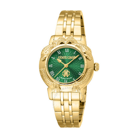 علبة وسوار من الفولاذ المقاوم للصدأ بلون الذهب الأصفر. إطار ثابت من الفولاذ المقاوم للصدأ بلون الذهب الأصفر. ميناء أخضر بعقارب ذهبية اللون وعلامات ساعات بأرقام رومانية. نوع الميناء: تناظري. حركة كوارتز. زجاج ياقوتي مقاوم للخدش. علبة دائرية الشكل، مقاسها: 32 مم. مشبك قابل للطي مع قفل أمان. مقاومة للماء حتى عمق 50 مترًا / 165 قدمًا. الوظائف: الساعات، الدقائق، الثواني. سلسلة ساعات أنيقة. طراز ساعات أنيقة. علامة الساعة: صناعة سويسرية. ساعة روبرتو كافالي أنيقة كوارتز نسائية بمينا خضراء RV1L227M0061.