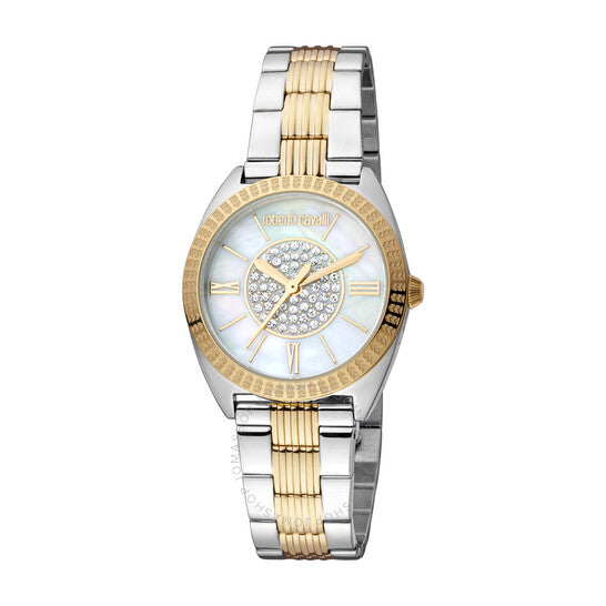 علبة من الفولاذ المقاوم للصدأ فضية اللون مع سوار من الفولاذ المقاوم للصدأ ثنائي اللون (فضي وذهبي أصفر). إطار ثابت من الفولاذ المقاوم للصدأ ذهبي أصفر. ميناء من عرق اللؤلؤ مع عقارب ومؤشرات ساعات ذهبية صفراء. نوع الميناء: تناظري. حركة كوارتز. زجاج معدني مقاوم للخدش. شكل العلبة دائري، مقاسها: 30 مم. مشبك قابل للطي مع مفتاح أمان. مقاومة للماء حتى عمق 50 مترًا / 165 قدمًا. الوظائف: الساعات، الدقائق، الثواني. سلسلة ساعات أنيقة. طراز ساعات أنيقة. ساعة روبرتو كافالي كوارتز نسائية RC5L022M0085.