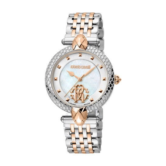 علبة من الفولاذ المقاوم للصدأ فضية اللون مع سوار من الفولاذ المقاوم للصدأ ثنائي اللون (فضي وذهبي وردي). إطار ثابت من الفولاذ المقاوم للصدأ فضي اللون. ميناء من عرق اللؤلؤ مع عقارب ومؤشرات ساعات ذهبية وردية اللون. نوع الميناء: تناظري. حركة كوارتز. زجاج ياقوتي مقاوم للخدش. علبة دائرية الشكل، مقاسها: 34 مم. مشبك قابل للطي مع قفل أمان. مقاومة للماء حتى عمق 50 مترًا / 165 قدمًا. الوظائف: الساعات، الدقائق، الثواني. سلسلة ساعات أنيقة. طراز ساعات أنيقة. علامة الساعة: صناعة سويسرية. ساعة روبرتو كافالي أنيقة كوارتز نسائية RV1L130M0081.