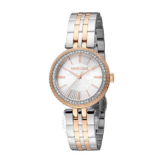 علبة من الفولاذ المقاوم للصدأ فضية اللون مع سوار من الفولاذ المقاوم للصدأ ثنائي اللون (فضي وذهبي وردي). إطار ثابت من الفولاذ المقاوم للصدأ ذهبي وردي. ميناء فضي اللون مع عقارب ومؤشرات ساعات ذهبية وردية اللون. نوع الميناء: تناظري. حركة كوارتز. زجاج معدني مقاوم للخدش. شكل العلبة دائري، مقاسها: 30 مم. مشبك قابل للطي مع قفل أمان. مقاومة للماء حتى عمق 50 مترًا / 165 قدمًا. الوظائف: الساعات، الدقائق، الثواني. سلسلة ساعات أنيقة. طراز ساعات أنيقة. ساعة روبرتو كافالي أنيقة كوارتز بمينا فضي، ساعة نسائية RC5L031M0105.