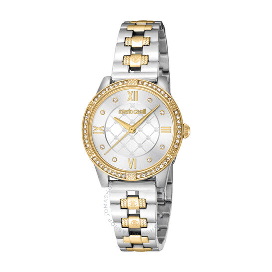 علبة من الفولاذ المقاوم للصدأ فضية اللون مع سوار من الفولاذ المقاوم للصدأ ثنائي اللون (فضي وذهبي أصفر). إطار ثابت من الفولاذ المقاوم للصدأ ذهبي أصفر. ميناء فضي اللون مع عقارب ومؤشرات ساعات ذهبية صفراء. نوع الميناء: تناظري. حركة كوارتز. زجاج معدني مقاوم للخدش. شكل العلبة دائري، مقاسها: 30 مم. مشبك قابل للطي مع قفل أمان. مقاومة للماء حتى عمق 50 مترًا / 165 قدمًا. الوظائف: الساعات، الدقائق، الثواني. سلسلة ساعات أنيقة. طراز ساعات أنيقة. ساعة روبرتو كافالي أنيقة كوارتز بمينا فضي، ساعة نسائية RC5L032M0085.