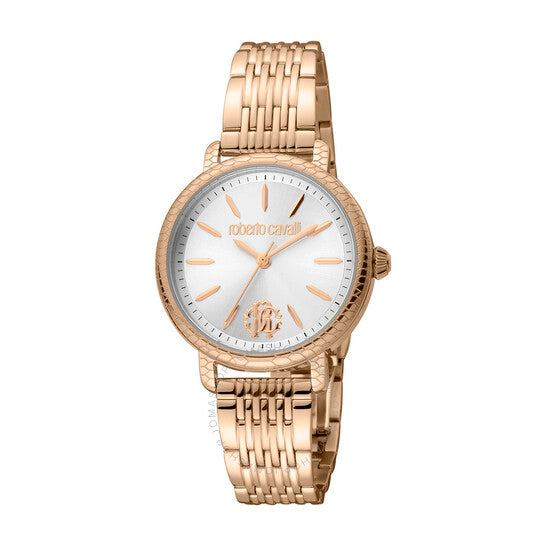 علبة وسوار من الفولاذ المقاوم للصدأ بلون الذهب الوردي. إطار ثابت من الفولاذ المقاوم للصدأ بلون الذهب الوردي. ميناء فضي اللون مع عقارب وعلامات ساعات ذهبية اللون. علامات دقائق حول الحافة الخارجية. نوع الميناء: تناظري. حركة كوارتز. زجاج معدني مقاوم للخدش. شكل العلبة دائري، مقاسها: 32 مم. مشبك قابل للطي مع قفل أمان. مقاومة للماء حتى عمق 50 مترًا / 165 قدمًا. الوظائف: الساعات، الدقائق، الثواني. سلسلة ساعات أنيقة. طراز ساعات أنيقة. ساعة روبرتو كافالي أنيقة كوارتز بمينا فضي، ساعة نسائية RC5L034M0065.