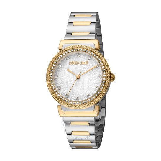 علبة من الفولاذ المقاوم للصدأ فضية اللون مع سوار من الفولاذ المقاوم للصدأ ثنائي اللون (فضي وذهبي أصفر). إطار ثابت من الفولاذ المقاوم للصدأ ذهبي أصفر. ميناء فضي اللون مع عقارب ومؤشرات ساعات ذهبية صفراء. نوع الميناء: تناظري. حركة كوارتز. زجاج معدني مقاوم للخدش. شكل العلبة دائري، مقاسها: 32 مم. مشبك قابل للطي مع قفل أمان. مقاومة للماء حتى عمق 50 مترًا / 165 قدمًا. وظائفها: الساعات، الدقائق، الثواني. سلسلة ساعات أنيقة. طراز ساعات أنيقة. ساعة روبرتو كافالي أنيقة كوارتز بمينا فضي، ساعة نسائية RC5L039M0085.