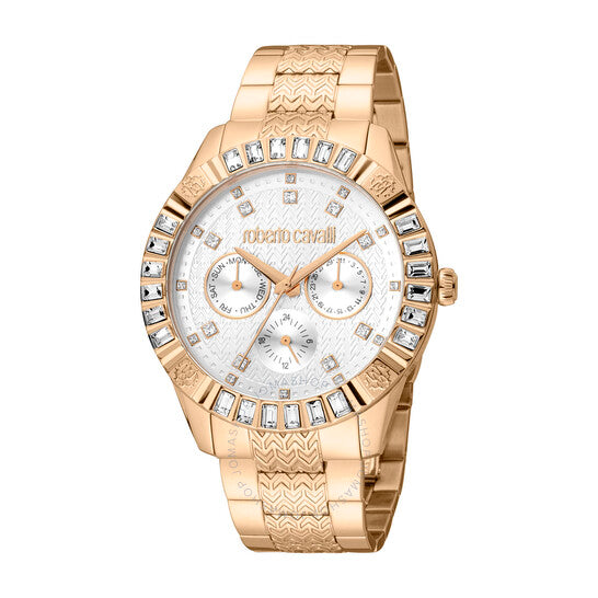 علبة وسوار من الفولاذ المقاوم للصدأ بلون الذهب الوردي. إطار ثابت من الفولاذ المقاوم للصدأ بلون الذهب الوردي. ميناء فضي اللون مع عقارب ومؤشرات ساعات بلون الذهب الوردي. نوع الميناء: تناظري. حركة كوارتز. زجاج معدني مقاوم للخدش. علبة دائرية الشكل، مقاسها: 40 مم. مشبك قابل للطي مع قفل أمان. مقاومة للماء حتى عمق 50 مترًا / 165 قدمًا. الوظائف: التاريخ، اليوم، الساعة، الدقيقة، الثانية. سلسلة ساعات أنيقة. طراز ساعات أنيقة. ساعة روبرتو كافالي أنيقة كوارتز نسائية بمينا فضي RC5L041M0085.