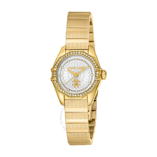 علبة وسوار من الفولاذ المقاوم للصدأ بلون الذهب الأصفر. إطار ثابت من الفولاذ المقاوم للصدأ بلون الذهب الأصفر. ميناء فضي اللون مع عقارب وعلامات ساعات ذهبية اللون. علامات دقائق حول الحافة الخارجية. نوع الميناء: تناظري. حركة كوارتز. زجاج معدني مقاوم للخدش. شكل العلبة دائري، مقاسها: ٢٦ مم. مشبك قابل للطي مع قفل أمان. مقاومة للماء حتى عمق ٥٠ مترًا / ١٦٥ قدمًا. الوظائف: الساعات، الدقائق، الثواني. سلسلة ساعات أنيقة. طراز ساعات أنيقة. ساعة روبرتو كافالي أنيقة كوارتز بمينا فضي، ساعة نسائية RC5L054M0055.
