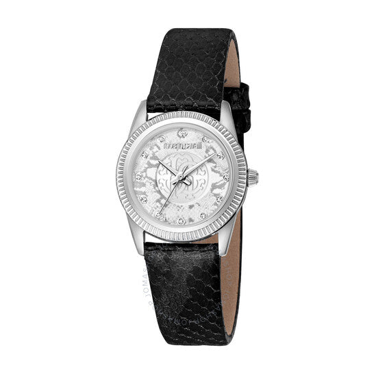 علبة من الفولاذ المقاوم للصدأ فضية اللون مع حزام جلدي أسود. إطار ثابت من الفولاذ المقاوم للصدأ فضي اللون. ميناء فضي اللون مع عقارب فضية اللون وعلامات ساعات. نوع الميناء: تناظري. حركة كوارتز. زجاج معدني مقاوم للخدش. شكل العلبة دائري، مقاسها: ٢٨ مم. مقاومة للماء حتى عمق ٥٠ مترًا / ١٦٥ قدمًا. الوظائف: الساعات، الدقائق، الثواني. سلسلة ساعات أنيقة. طراز ساعات أنيقة. ساعة روبرتو كافالي أنيقة كوارتز نسائية بمينا فضي RC5L074L0015.