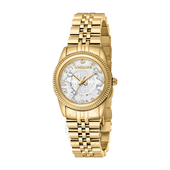 علبة وسوار من الفولاذ المقاوم للصدأ بلون الذهب الأصفر. إطار ثابت من الفولاذ المقاوم للصدأ بلون الذهب الأصفر. ميناء فضي اللون مع عقارب ومؤشرات ساعات ذهبية اللون. نوع الميناء: تناظري. حركة كوارتز. زجاج معدني مقاوم للخدش. علبة دائرية الشكل، مقاسها: ٢٨ مم. مشبك قابل للطي مع قفل أمان. مقاومة للماء حتى عمق ٥٠ مترًا / ١٦٥ قدمًا. الوظائف: الساعات، الدقائق، الثواني. سلسلة ساعات أنيقة. طراز ساعات أنيقة. ساعة روبرتو كافالي أنيقة كوارتز بمينا فضي، ساعة نسائية RC5L074M0055.