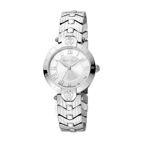 علبة وسوار من الفولاذ المقاوم للصدأ فضي اللون. إطار ثابت من الفولاذ المقاوم للصدأ فضي اللون. ميناء فضي اللون مع عقارب فضية اللون وعلامات ساعات بأرقام رومانية. نوع الميناء: تناظري. حركة كوارتز. زجاج ياقوت مقاوم للخدش. علبة دائرية الشكل، مقاسها: 30 مم. مشبك قابل للطي مع قفل أمان. مقاومة للماء حتى عمق 50 مترًا / 165 قدمًا. الوظائف: الساعات، الدقائق، الثواني. سلسلة ساعات أنيقة. طراز ساعات أنيقة. علامة الساعة: صناعة سويسرية. ساعة روبرتو كافالي أنيقة كوارتز بمينا فضي، ساعة نسائية RV1L166M0041.