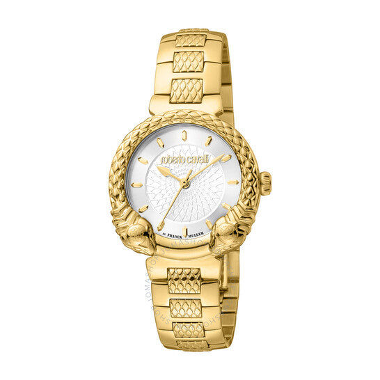 علبة وسوار من الفولاذ المقاوم للصدأ بلون الذهب الأصفر. إطار ثابت من الفولاذ المقاوم للصدأ بلون الذهب الأصفر. ميناء فضي اللون مع عقارب ومؤشرات ساعات ذهبية اللون. نوع الميناء: تناظري. حركة كوارتز. زجاج ياقوتي مقاوم للخدش. علبة دائرية الشكل، مقاسها: 32 مم. مشبك قابل للطي مع قفل أمان. مقاومة للماء حتى عمق 50 مترًا / 165 قدمًا. الوظائف: الساعات، الدقائق، الثواني. سلسلة ساعات أنيقة. طراز ساعات أنيقة. علامة الساعة: صناعة سويسرية. ساعة روبرتو كافالي أنيقة كوارتز بمينا فضي، ساعة نسائية RV1L190M0041.