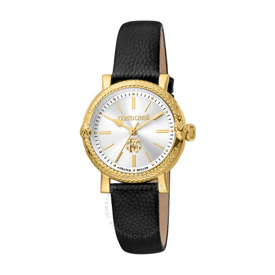 علبة من الفولاذ المقاوم للصدأ بلون الذهب الأصفر مع سوار جلدي أسود. إطار ثابت من الفولاذ المقاوم للصدأ بلون الذهب الأصفر. ميناء فضي اللون مع عقارب ومؤشرات ساعات بلون الذهب الأصفر. مؤشرات دقائق حول الحافة الخارجية. نوع الميناء: تناظري. حركة كوارتز. زجاج ياقوتي مقاوم للخدش. علبة دائرية الشكل، مقاسها: 30 مم. مقاومة للماء حتى عمق 50 مترًا / 165 قدمًا. الوظائف: الساعات، الدقائق، الثواني. سلسلة ساعات أنيقة. طراز ساعات أنيقة. علامة الساعة: صناعة سويسرية. ساعة روبرتو كافالي أنيقة كوارتز بمينا فضي، ساعة نسائية RV1L193L0021.
