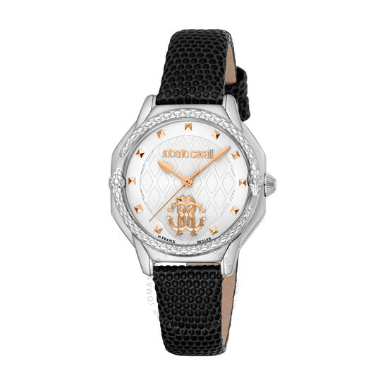 علبة من الفولاذ المقاوم للصدأ فضية اللون مع سوار جلدي أسود. إطار ثابت من الفولاذ المقاوم للصدأ فضي اللون. ميناء فضي اللون مع عقارب ومؤشرات ساعات ذهبية وردية اللون. نوع الميناء: تناظري. حركة كوارتز. زجاج ياقوتي مقاوم للخدش. شكل العلبة دائري، مقاسها: 32 مم. مقاومة للماء حتى عمق 50 مترًا / 165 قدمًا. الوظائف: الساعات، الدقائق، الثواني. سلسلة ساعات أنيقة. طراز ساعات أنيقة. علامة الساعة: صناعة سويسرية. ساعة روبرتو كافالي أنيقة كوارتز بمينا فضي، ساعة نسائية RV1L225L0011.