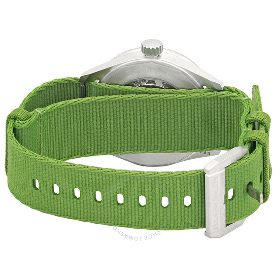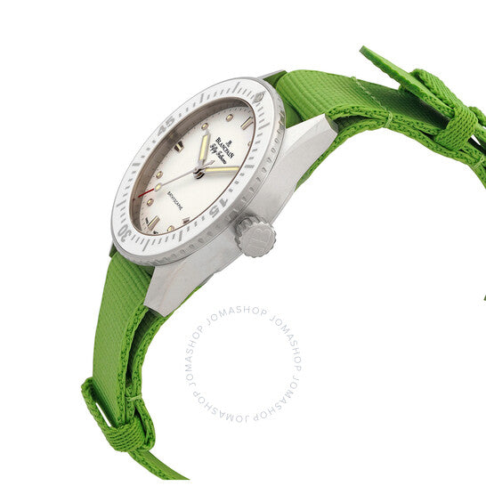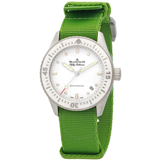 علبة فضية اللون من الفولاذ المقاوم للصدأ مع سوار قماشي أخضر. إطار دوار أحادي الاتجاه من الفولاذ المقاوم للصدأ فضي اللون. ميناء أبيض بعقارب وعلامات ساعات فضية اللون. علامات دقائق حول الحافة الخارجية. نوع الميناء: تناظري. عقارب وعلامات مضيئة. عرض التاريخ بين موضعي الساعة 4 و5. حركة أوتوماتيكية من بلانكبان كاليبر 1150، تحتوي على 28 جوهرة، مكونة من 210 أجزاء، تنبض بمعدل 21600 ذبذبة في الساعة، ولديها احتياطي طاقة يصل إلى 100 ساعة تقريبًا. زجاج ياقوت مقاوم للخدش. تاج لولبي. غطاء خلفي شفاف. شكل العلبة دائري، مقاسها: 38 مم، سمكها: 10.77 مم. مشبك تانغ. مقاومة للماء حتى عمق 300 متر / 1000 قدم. الوظائف: التاريخ، الساعة، الدقائق، الثواني. سلسلة فيفتي فاذومز. طراز ساعة الغوص. ملصق الساعة: صناعة سويسرية. ساعة بلانكبان فيفتي فاذومز باثيسكاف أوتوماتيكية بمينا أبيض 5100-1127-naha.