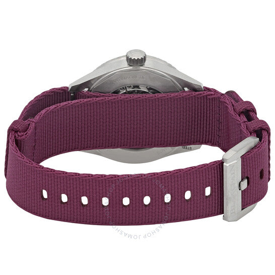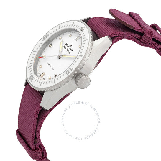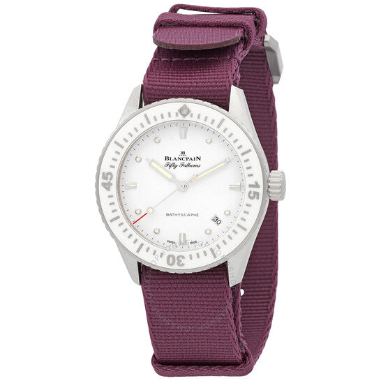 علبة فضية اللون من الفولاذ المقاوم للصدأ مع سوار قماشي بنفسجي. إطار دوار أحادي الاتجاه من الفولاذ المقاوم للصدأ الأبيض. ميناء أبيض بعقارب فضية اللون وعلامات ساعات. علامات دقائق حول الحافة الخارجية. نوع الميناء: تناظري. عرض التاريخ بين موضعي الساعة الرابعة والخامسة. حركة أوتوماتيكية من بلانكبان كاليبر 1150، تحتوي على 28 جوهرة، مكونة من 210 أجزاء، تنبض بمعدل 21600 ذبذبة في الساعة، ولديها احتياطي طاقة يصل إلى 100 ساعة تقريبًا. زجاج ياقوت مقاوم للخدش. تاج لولبي. غطاء خلفي شفاف. شكل العلبة دائري، مقاسها: 38 مم، سمكها: 10.77 مم. مشبك تانغ. مقاومة للماء حتى عمق 300 متر / 1000 قدم. الوظائف: التاريخ، الساعة، الدقائق، الثواني. سلسلة فيفتي فاذومز. طراز ساعة الغوص. ملصق الساعة: صناعة سويسرية. ساعة بلانكبان فيفتي فاذومز باثيسكاف أوتوماتيكية بمينا أبيض 5100-1127-NAVA.