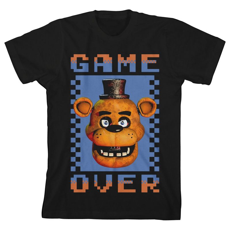 - تصميم مخصص: رأس فريدي فازبير أمام خلفية زرقاء على هذا التيشيرت الجرافيكي، بينما تُكتب عبارة "انتهت اللعبة" بأحرف بكسل زرقاء وبرتقالية. سيُعجب عشاق ألعاب الفيديو "خمس ليالٍ في فريدي" بهذا التصميم الممتع.