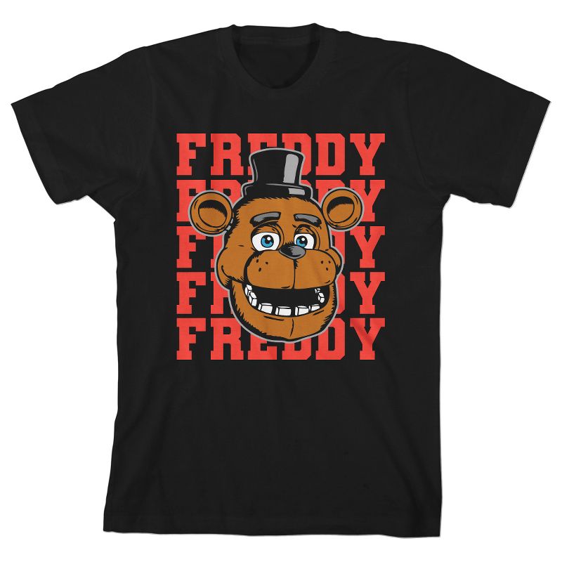 استعدوا لفريدي مع هذا التيشيرت الشبابي. يتميز هذا القميص بوجه فريدي فازبير، مع كتابة حمراء في الخلفية تكرّر اسمه. يأتي التيشيرت بأكمام قصيرة وياقة دائرية سوداء، وهو هدية رائعة لمحبي لعبة الفيديو "خمس ليالٍ في فريدي".