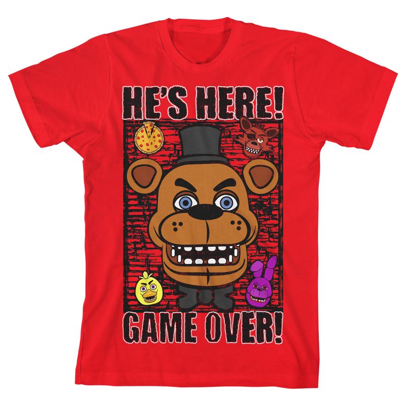 استعدوا لفريدي مع هذا التيشيرت الولادي. يحمل القميص وجه فريدي فازبير أمام جدار من الطوب. زوايا الجدار مزينة بأيقونة بيتزا وأيقونات الروبوتات المتحركة الأخرى: بوني، تشيكا، وفوكسي. حروف سوداء أعلى الصورة تحذر: "إنه هنا!" وحروف سوداء أسفلها تقول: "انتهت اللعبة!". سيحب عشاق لعبة البقاء الصغار هذا التيشيرت.