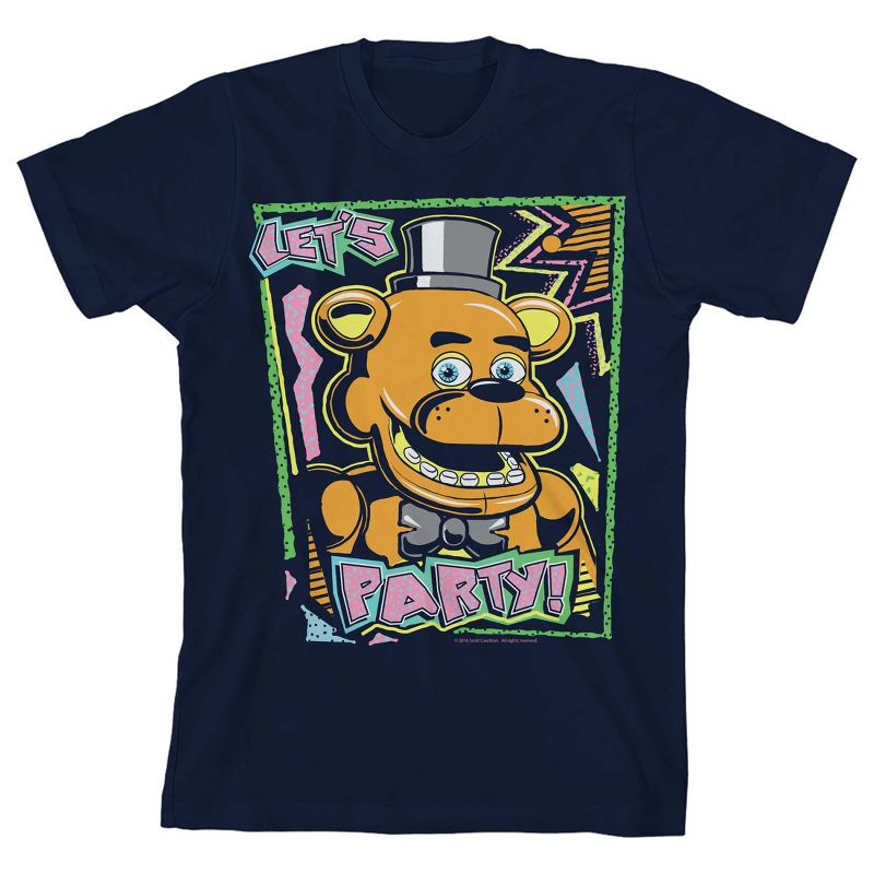 - تيشيرت برسومات جرافيكية: فريدي فازبير محاط بأشكال زرقاء ووردية وصفراء زاهية. فوقه وأسفله، كُتب باللون الوردي: "هيا نحتفل". هذا التيشيرت هدية رائعة لمحبي فريدي الصغار.