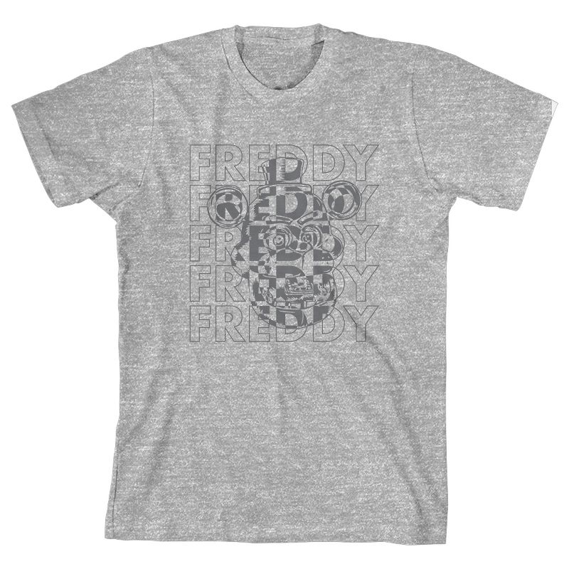- تيشيرت جرافيكي: حروف واضحة بخطوط سوداء تُكرر كلمة فريدي، بينما يظهر وجه فريدي في المقدمة. تتحول الحروف إلى اللون الأسود عند تقاطعها خلف فريدي. سيُعجب مُحبو ألعاب "الليالي الخمس" بهذا التصميم المُمتع.