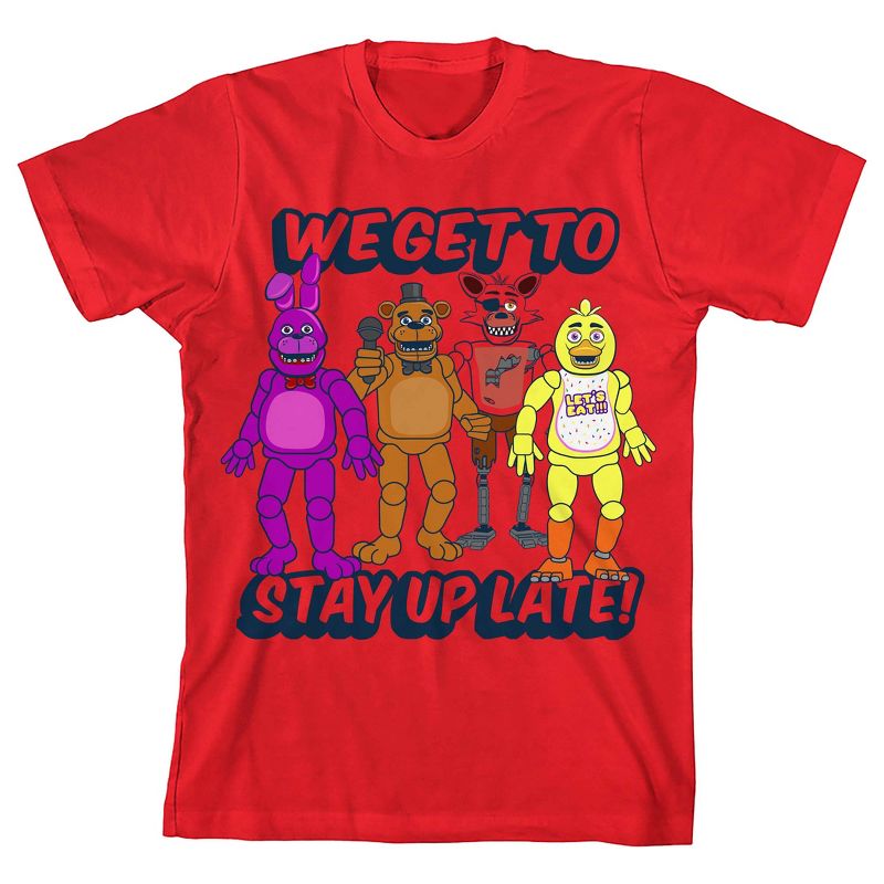 قاوم ليلتك بارتداء تيشيرت فريدي هذا. يحمل القميص شخصيات بوني، فريدي، فوكسي، وتشيكا المتحركة، متجهةً نحو الخارج. مكتوب عليه "سنسهر حتى وقت متأخر!" بأحرف حمراء مع خطوط زرقاء وظلال. يأتي القميص بأكمام قصيرة حمراء. سيحبه محبو سلسلة فريدي الصغار.