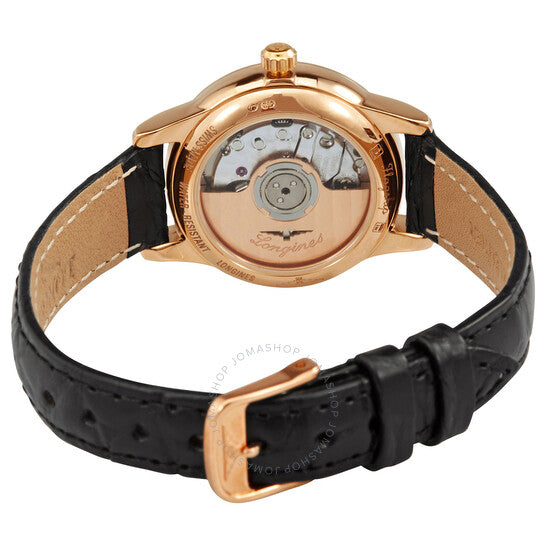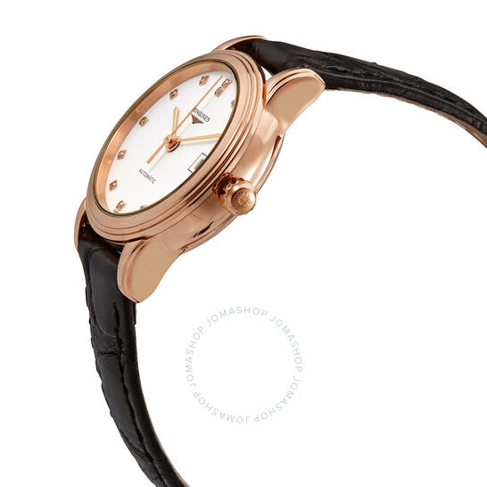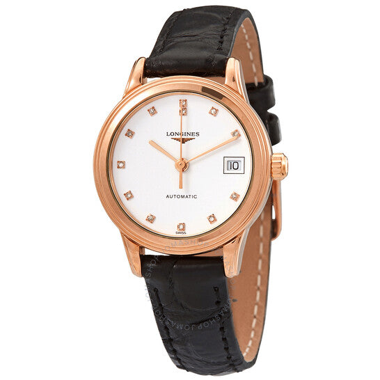 علبة من الذهب الوردي عيار ١٨ قيراطًا مع سوار أسود من جلد التمساح. إطار ثابت من الذهب الوردي عيار ١٨ قيراطًا. ميناء أبيض بعقارب من الذهب الوردي وعلامات ساعات من الألماس. نوع الميناء: تناظري. عرض التاريخ عند موضع الساعة الثالثة. حركة أوتوماتيكية من لونجين، عيار L595، مبنية على ETA 2000/1، تحتوي على ٢٠ جوهرة، تنبض بتردد ٢٨٨٠٠ ذبذبة في الساعة، ولديها احتياطي طاقة يقارب ٤٠ ساعة. زجاج من الياقوت المقاوم للخدش. تاج قابل للسحب/الدفع. غطاء خلفي شفاف. شكل دائري. حجم العلبة: ٢٦ مم. سمكها: ٨ مم. مشبك تانغ. مقاومة للماء حتى عمق ٣٠ مترًا / ١٠٠ قدم. الوظائف: التاريخ، الساعة، الدقيقة، الثانية. سلسلة فلاجشيب. طراز ساعة رسمية. علامة الساعة: صناعة سويسرية. ساعة لونجين فلاجشيب أوتوماتيكية نسائية بمينا بيضاء مرصعة بالألماس L4.274.8.27.2.