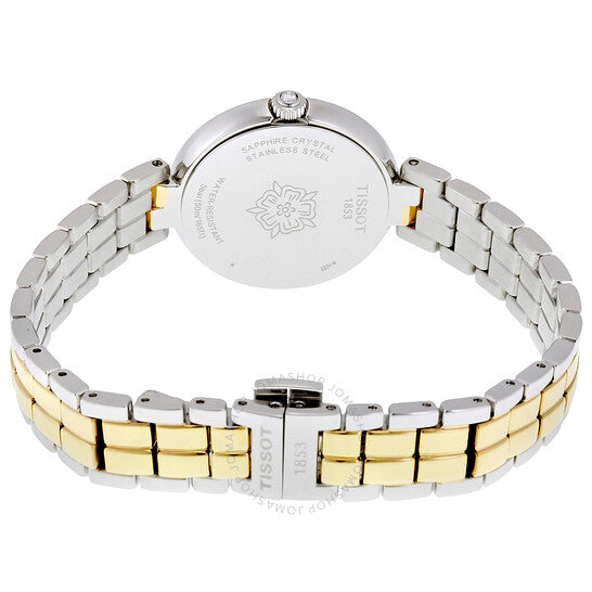 علبة من الفولاذ المقاوم للصدأ مع سوار من الفولاذ المقاوم للصدأ ثنائي اللون (فضي وذهبي أصفر مطلي بتقنية الترسيب الفيزيائي للبخار). إطار ثابت من الذهب الأصفر مطلي بتقنية الترسيب الفيزيائي للبخار. ميناء أبيض من عرق اللؤلؤ مع عقارب ذهبية اللون وعلامات ساعات. نوع الميناء: تناظري. نافذة عرض التاريخ أعلى موضع الساعة السادسة. حركة كوارتز ETA عيار F04.111. كريستال ياقوتي مقاوم للخدش. تاج قابل للسحب/الدفع. غطاء خلفي صلب. حجم العلبة: 26 مم. سمكها: 6.35 مم. شكلها دائري. عرض السوار: 7 مم. مشبك قابل للطي. مقاومة للماء حتى عمق 50 مترًا / 165 قدمًا. الوظائف: التاريخ، الساعة، الدقيقة، الثانية. طراز ساعة رسمية. علامة الساعة: صناعة سويسرية. ساعة تيسوت فلامنغو نسائية بمينا عرق اللؤلؤ T094.210.22.111.01.