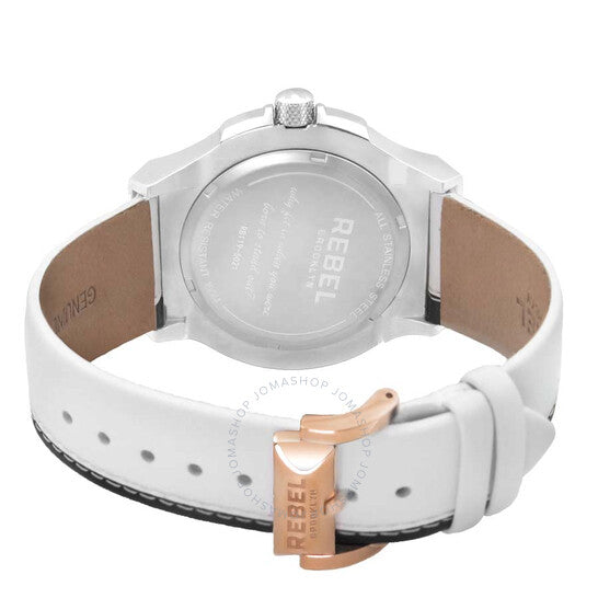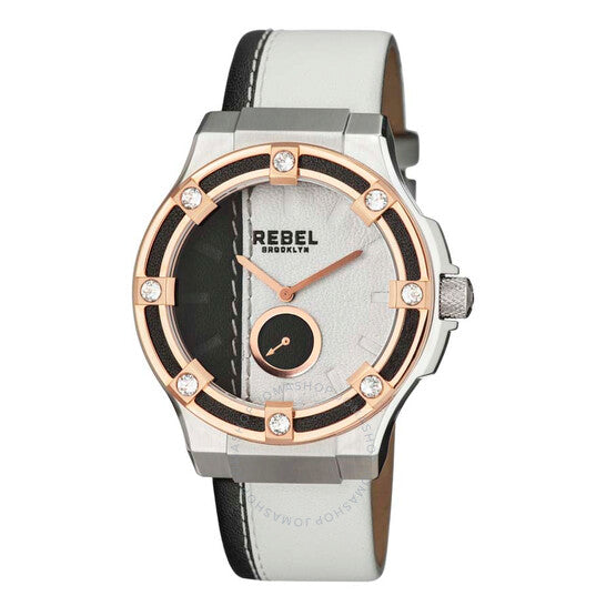 علبة من الفولاذ المقاوم للصدأ مع سوار جلدي أسود وأبيض. إطار ثابت بلون الذهب الوردي مع حلقة سوداء مرصعة بالكريستال. ميناء أسود وأبيض مع عقارب وعلامات ساعات ذهبية وردية. نوع الميناء: تناظري. ميناء فرعي أسود للثواني الصغيرة. آلية حركة كوارتز. زجاج معدني مقاوم للخدش. تاج ضغط/سحب. غطاء خلفي صلب. شكل دائري. حجم العلبة: 44 مم. سمكها: 11 مم. عرض السوار: 23 مم. طول السوار: 7.5 بوصة. مشبك تانغ. مقاومة للماء حتى عمق 50 مترًا / 165 قدمًا. الوظائف: الساعات، الدقائق، الثواني. سلسلة فلاتبوش. تصميم كاجوال. ساعة ريبيل فلاتبوش النسائية RB119-5021 بمينا أسود وأبيض.
