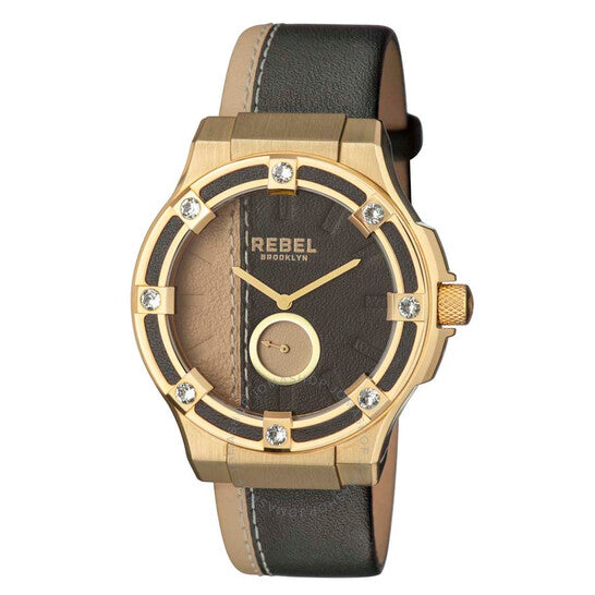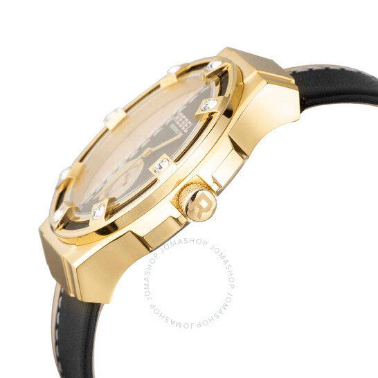 علبة من الفولاذ المقاوم للصدأ بلون ذهبي مع سوار جلدي أسود وذهبي. إطار ثابت من الفولاذ المقاوم للصدأ بلون ذهبي. ميناء أسود وذهبي مع عقارب ومؤشرات ساعات ذهبية اللون. نوع الميناء: تناظري. ميناء فرعي واحد - 60 ثانية. آلية حركة كوارتز. زجاج معدني مقاوم للخدش. تاج ضغط/سحب. غطاء خلفي صلب. شكل دائري، مقاس العلبة: 44 مم، سمكها: 11 مم. عرض السوار: 23 مم، طوله: 7.5 بوصة. مشبك تانغ. مقاومة للماء حتى عمق 50 مترًا / 165 قدمًا. الوظائف: الساعات، الدقائق، الثواني. تصميم كاجوال. ساعة ريبيل فلاتبوش نسائية RB119-9071.
