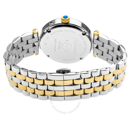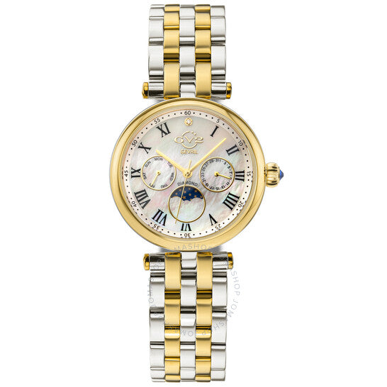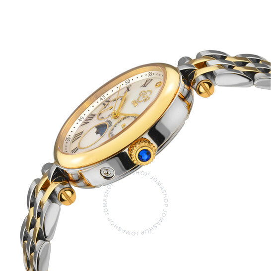علبة من الفولاذ المقاوم للصدأ بلون ذهبي مع سوار من الفولاذ المقاوم للصدأ بلونين (فضي وذهبي). إطار ثابت من الفولاذ المقاوم للصدأ بلون ذهبي. ميناء من عرق اللؤلؤ مع عقارب ذهبية اللون وأرقام رومانية وعلامات ساعات من الألماس. علامات دقائق حول الحافة الخارجية. نوع الميناء: تناظري. عرض التاريخ عند موضع الساعة 3. موانئ فرعية لثلاثة أيام، والتاريخ، ومراحل القمر. آلية حركة كوارتز. زجاج ياقوتي مقاوم للخدش. تاج قابل للسحب/الدفع. غطاء خلفي صلب. شكل دائري. حجم العلبة: 36 مم. عرض السوار: 18 مم. مشبك قابل للطي بزر ضغط. مقاومة للماء حتى عمق 50 مترًا / 165 قدمًا. الوظائف: التاريخ، اليوم، الساعة، الدقيقة، الثانية، ومراحل القمر. تصميم عصري. علامة الساعة: صناعة سويسرية. ساعة GV2 من جيفريل فلورنس كوارتز ألماس نسائية 12505B.