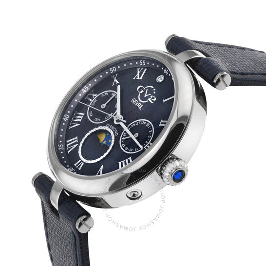 علبة من الفولاذ المقاوم للصدأ فضية اللون مع سوار من الجلد الأصلي أزرق. إطار ثابت من الفولاذ المقاوم للصدأ فضي اللون. ميناء من عرق اللؤلؤ مع عقارب فضية اللون وعلامات ساعات بأرقام رومانية. علامات دقائق حول الحافة الخارجية. نوع الميناء: تناظري. حركة كوارتز. زجاج ياقوت مقاوم للخدش. تاج قابل للسحب/الدفع. غطاء خلفي صلب. شكل دائري، مقاس العلبة: 36 مم، سمكها: 12 مم. عرض السوار: 18 مم. مشبك بإبزيم. مقاومة للماء حتى عمق 50 مترًا / 165 قدمًا. الوظائف: التاريخ، اليوم، الساعة، الدقيقة، الثانية. معلومات إضافية: ميناء فرعي لليوم والتاريخ مع ميناء فرعي لأطوار القمر. سلسلة فلورنس. ساعة أنيقة. ساعة GV2 من جيفريل فلورنس كوارتز نسائية 12512.L.