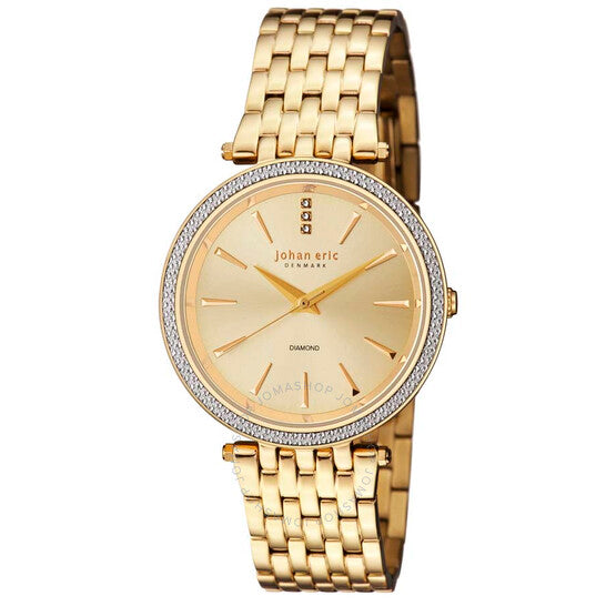 علبة وسوار من الفولاذ المقاوم للصدأ مطليان بالأيون من الذهب الأصفر. إطار ثابت (مقصوص بالألماس) مطلي بالأيون من الذهب الأصفر. ميناء ذهبي مع عقارب وعلامات ساعات ذهبية اللون. يظهر مؤشر مرصع بالألماس عند موضع الساعة ١٢. نوع الميناء: تناظري. حركة كوارتز. زجاج معدني مقاوم للخدش. تاج قابل للسحب/الدفع. غطاء خلفي صلب. شكل دائري. حجم العلبة: ٣٦.٧٥ مم. سمكها: ٧ مم. عرض السوار: ١٨.٣ مم. طول السوار: ٧.٥ بوصة. مشبك قابل للطي بزر ضغط. مقاومة للماء حتى عمق ٥٠ مترًا / ١٦٥ قدمًا. الوظائف: الساعات، الدقائق، الثواني. سلسلة فريديريسيا. ساعة كاجوال أنيقة. ساعة يوهان إريك فريديريسيا النسائية بمينا ذهبي JE-F1000-02-002B.