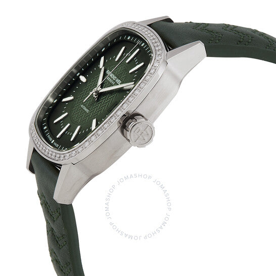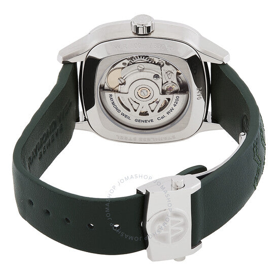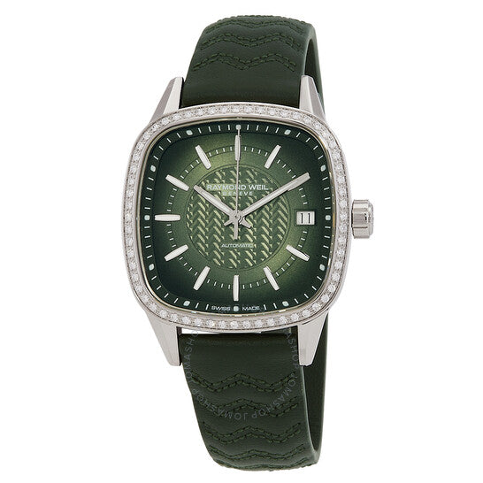 علبة من الفولاذ المقاوم للصدأ فضية اللون مع سوار جلدي أخضر. إطار ثابت فضي اللون مرصع بالألماس. ميناء أخضر متدرج اللون مع عقارب وعلامات ساعات فضية اللون. علامات دقائق حول الحافة الخارجية. نوع الميناء: تناظري. عقارب وعلامات مضيئة. نافذة عرض التاريخ عند موضع الساعة 3. آلية حركة يدوية من ريموند ويل كاليبر RW4200 مع احتياطي طاقة لمدة 38 ساعة. زجاج ياقوت مقاوم للخدش. غطاء خلفي شفاف. شكل العلبة مربع، أبعادها: 34.5 × 34.5 مم، سُمكها: 9.3 مم. مشبك قابل للطي مع مفتاح أمان. مقاومة للماء حتى عمق 100 متر / 330 قدمًا. الوظائف: التاريخ، الساعة، الدقيقة، الثانية. معلومات إضافية: عدد الماسات: 60؛ وزن قيراط الماس: 0.399 قيراط. سلسلة فريلانسر. طراز ساعة رسمية. علامة الساعة: صناعة سويسرية. ساعة ريموند ويل فريلانسر أوتوماتيكية مرصعة بالألماس للسيدات 2490-SCS-52051.
