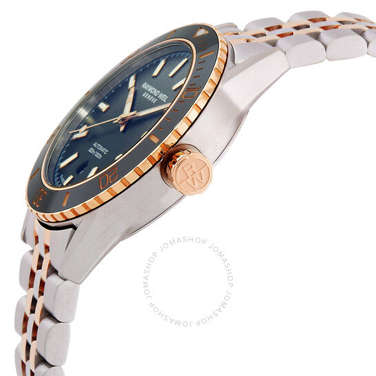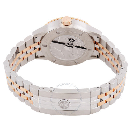 علبة من الفولاذ المقاوم للصدأ فضية اللون مع سوار من الفولاذ المقاوم للصدأ ثنائي اللون (فضي وذهبي وردي). إطار دوار أحادي الاتجاه من السيراميك الأسود. ميناء رمادي اللون مع عقارب وعلامات ساعات ذهبية وردية اللون. علامات دقائق حول الحافة الخارجية. نوع الميناء: تناظري. عقارب وعلامات مضيئة. عرض التاريخ عند موضع الساعة السادسة. حركة أوتوماتيكية من طراز Sellita Caliber SW200، تحتوي على 26 جوهرة، تنبض بمعدل 28800 ذبذبة في الساعة، ولديها احتياطي طاقة يدوم حوالي 38 ساعة. زجاج من الياقوت المقاوم للخدش. تاج لولبي. غطاء خلفي صلب. شكل العلبة دائري، مقاسها: 42.5 مم. مشبك قابل للطي مع مفتاح أمان. مقاومة للماء حتى عمق 300 متر / 1000 قدم. الوظائف: التاريخ، الساعة، الدقائق، الثواني. سلسلة Freelancer. طراز ساعة الغوص. علامة الساعة: صناعة سويسرية. ساعة ريموند ويل فريلانسر أوتوماتيكية للرجال بمينا رمادي 2775-S51-20051.